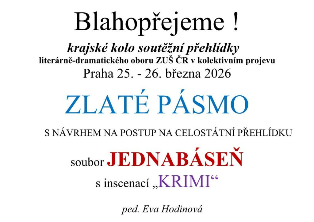 Děkujeme všem zúčastněným hráčům a jejich pedagogům, blahopřejeme k oceněním. Postupujícím do celostátního kola soutěže, které se koná ve dnech 14.-17. 5. na ZUŠ Jana Hanuše, fandíme a držíme palce!