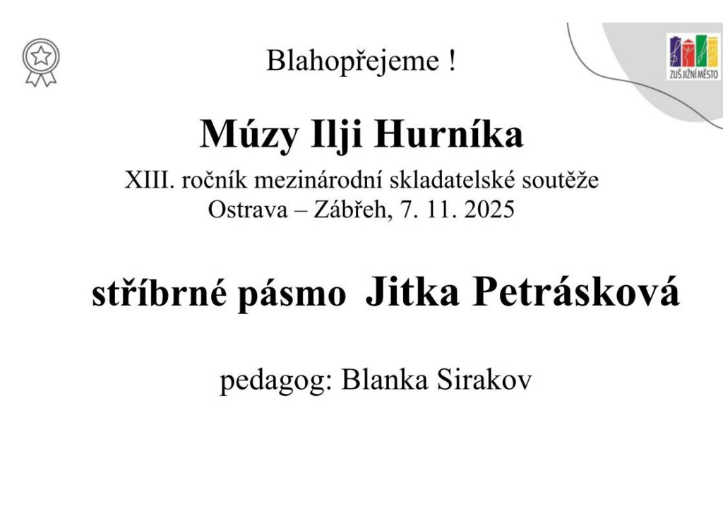 Blahopřejeme Jitce Petráskové k získání stříbrného pásma v XIII. mezinárodní skladatelské soutěži Múzy Ilji Hurníka, pořádané ZUŠ Ostrava – Zábřeh a sdružením MÚZA! Všechny soutěžní skladby je možné si poslechnout na této stránce: https://muzamsk.cz/skladatelska-soutez-xiii-muzy-i-hurnika-zna-sve-viteze/